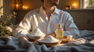 男性の体臭の基礎知識をテーマに、白いシャツとミネラル素材、アロマボトルを上品に配置したアイキャッチ画像